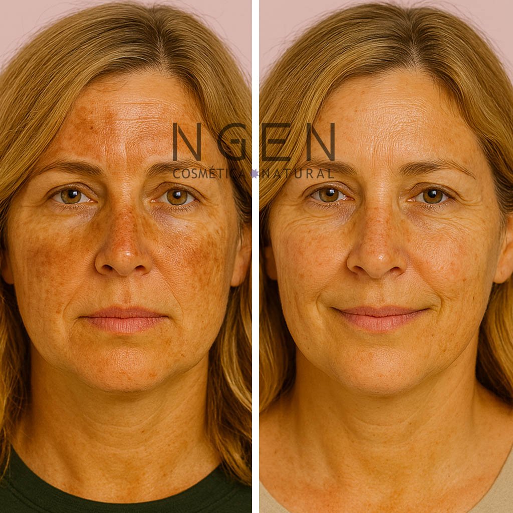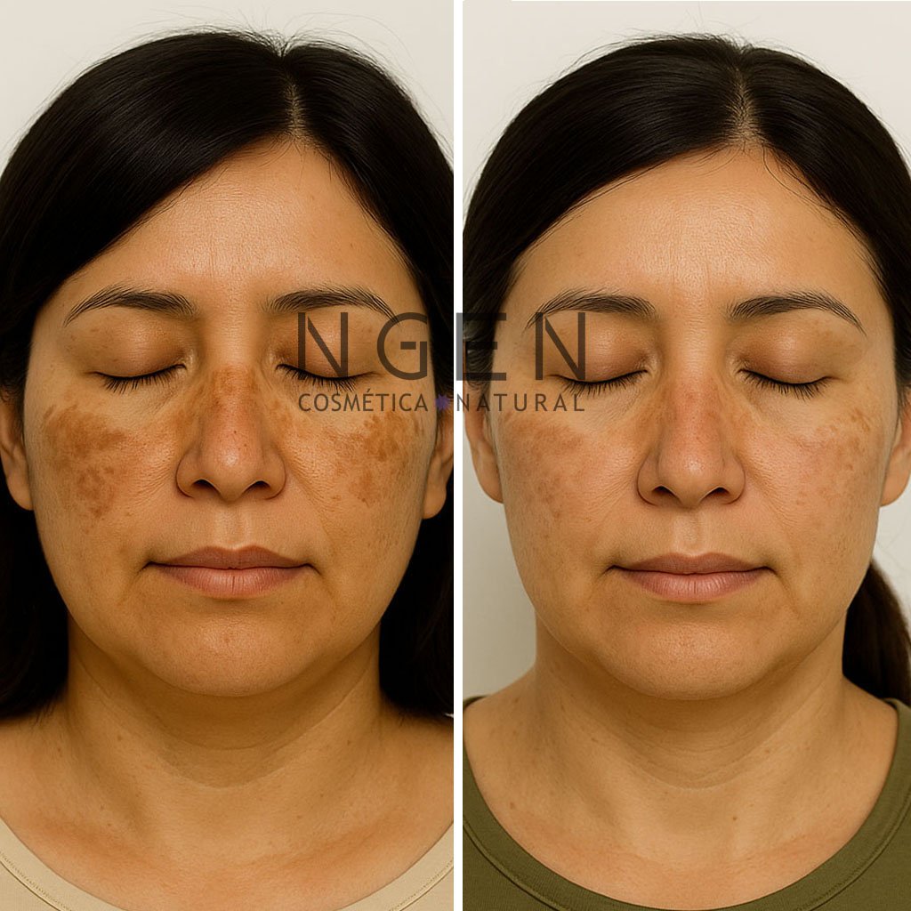 Con uso constante, la piel suele verse más luminosa y con tono más uniforme a partir de 6–8 semanas; este es un plazo típico descrito en estudios con vitamina C tópica y combinaciones despigmentantes, siendo importante destacar que los resultados son individuales y pueden variar de una piel a otra. En las imagenes adjuntas puedes ver resultados reales del uso continuo del set facial antimanchas.